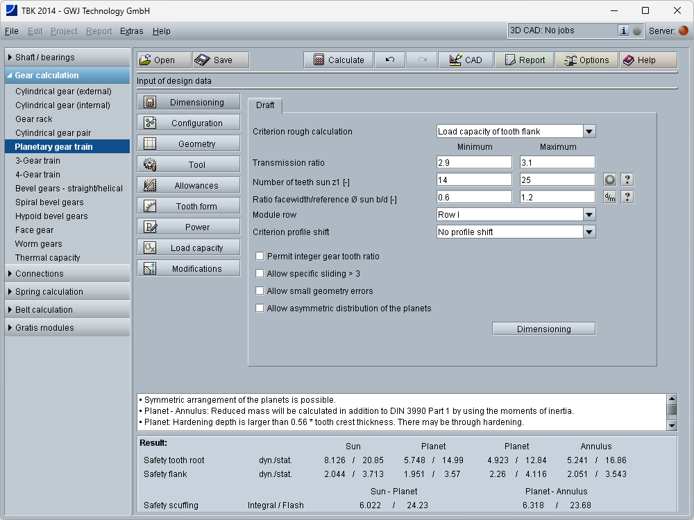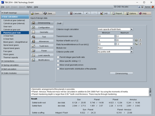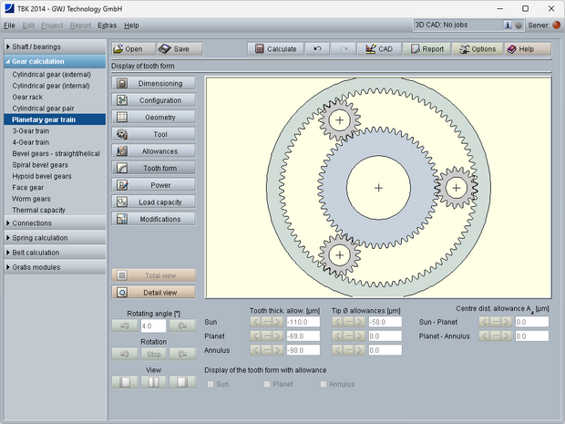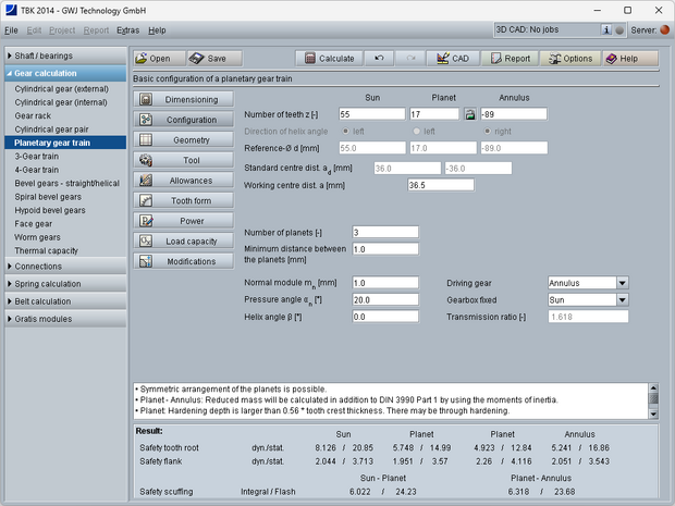This gear calculation module allows a fast and easy calculation of planetary gear trains with any number of planet gears. There are different drive configurations possible. The configuration part of the module provides a fast solution regarding special requirements. By choosing the number of teeth and a selected drive configuration, the transmission ratio is immediately determined. Furthermore, the standard centre distances of cylindrical gear pairs sun/planet and planet/annulus are displayed. The working centre distance can be defined. The symmetric arrangement of planet gears and the defined minimum distance are checked. If a symmetric arrangement of planet gears is not possible, a suggestion for an unsymmetric arrangement will be displayed.