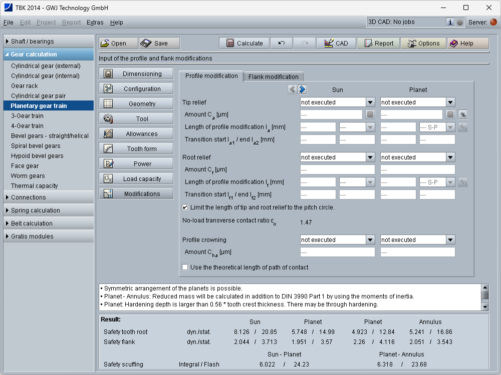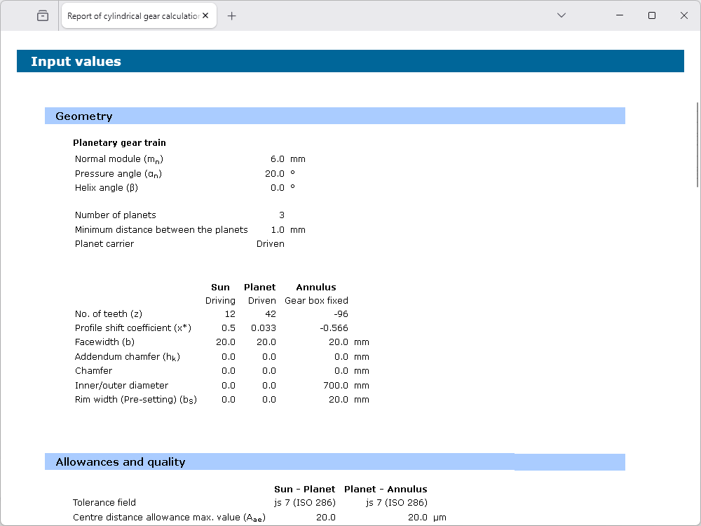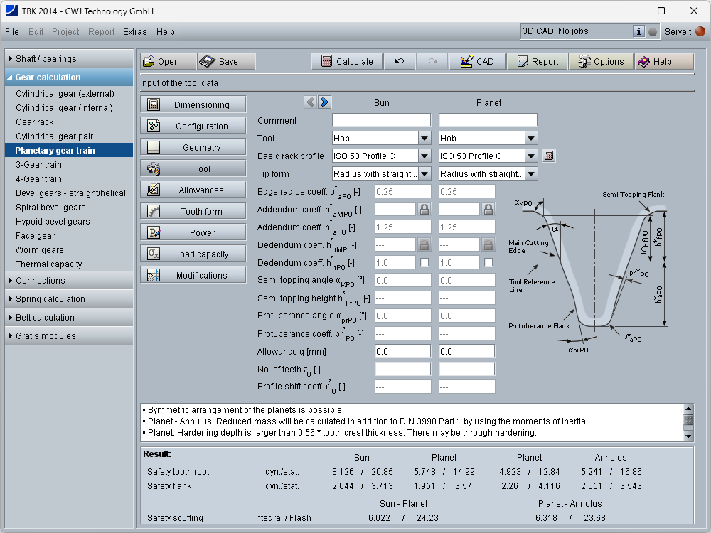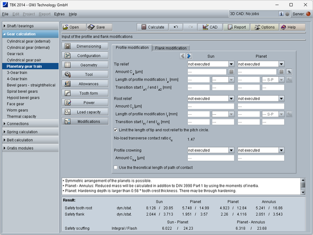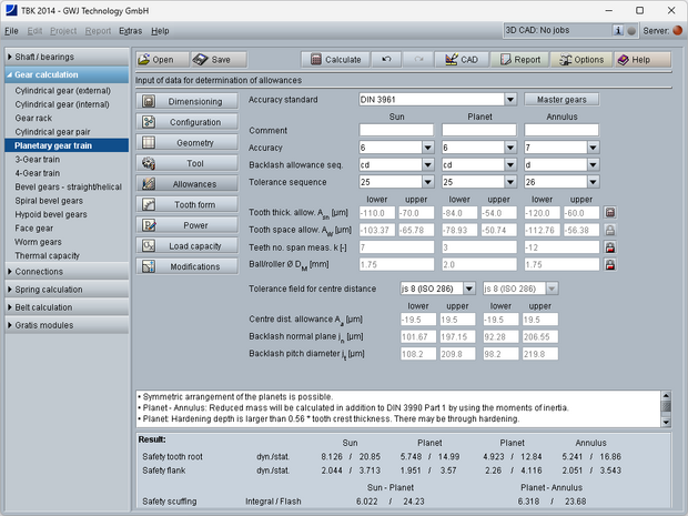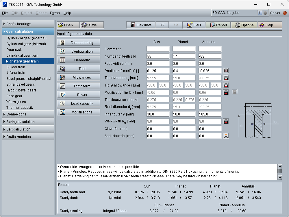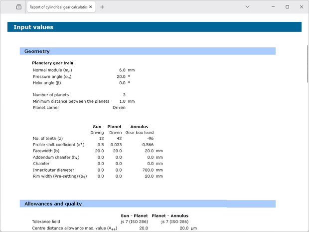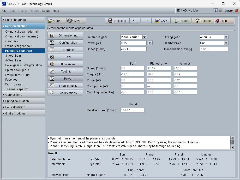 In addition to the geometry calculation, the torques, speeds, relative speed of the planet gear, power, pitch power, coupling power are determined as well. Tangential force of the planet carrier as well as centrifugal force of the planet are calculated.