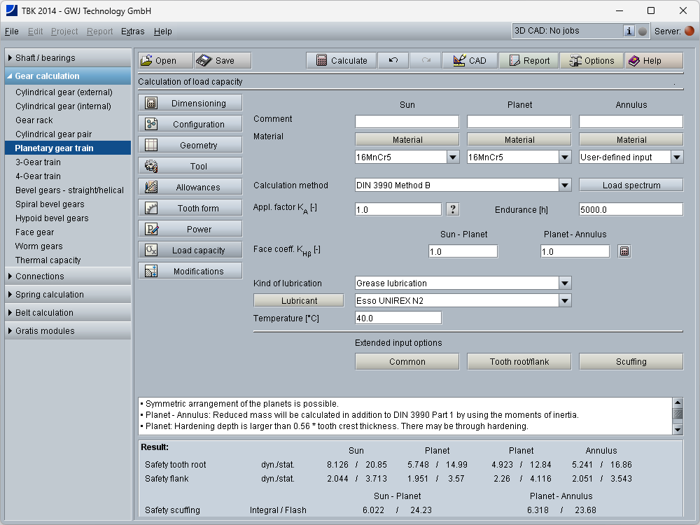 - Calculation of the load capacity according to DIN 3990 Method B, ISO 6336 Method B and ISO/TR 13989 (scuffing) with integrated material and lubricant database