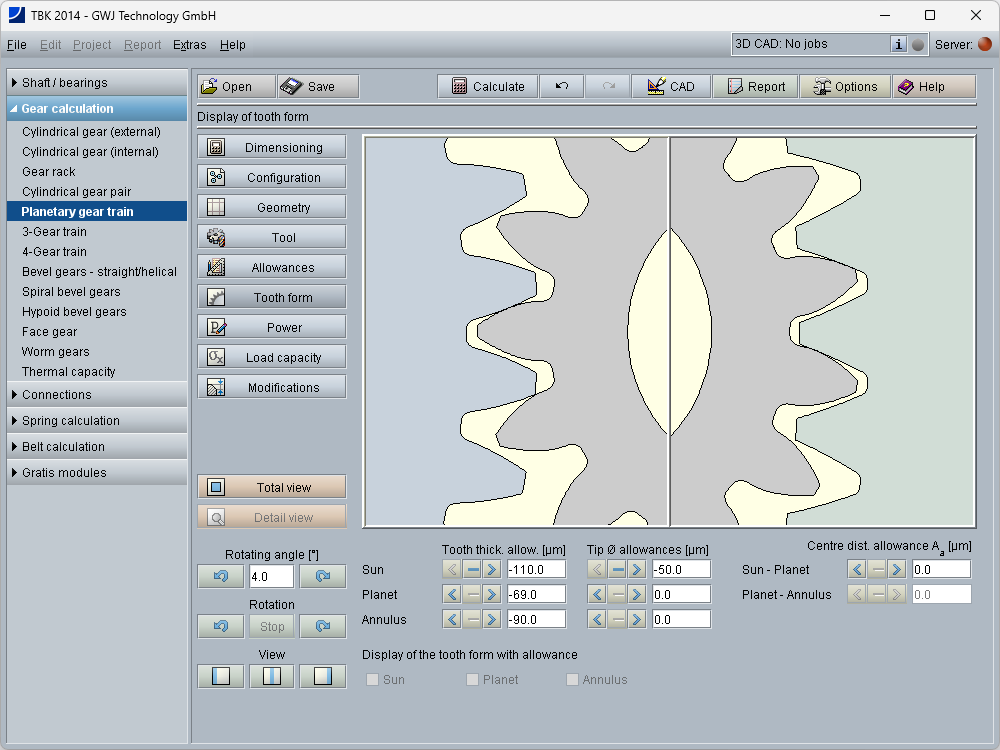 A special highlight of the calculation module is the display of the accurate calculated tooth form with a parallel animation/simulation of the tooth mesh of sun/planet and planet/annulus.