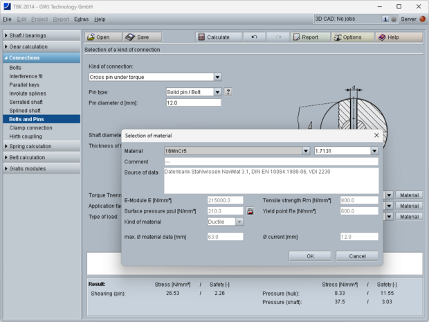 An extensive material database is available. The user can manually enter material properties. There, the E-Module, tensile strength, kind of material and yield point can be defined. The permissible surface pressures are determined from yield point and tensile strength and can be defined manually.