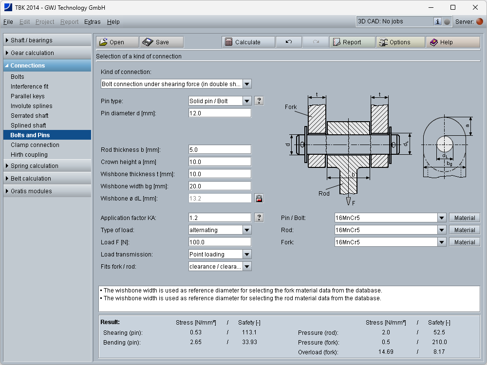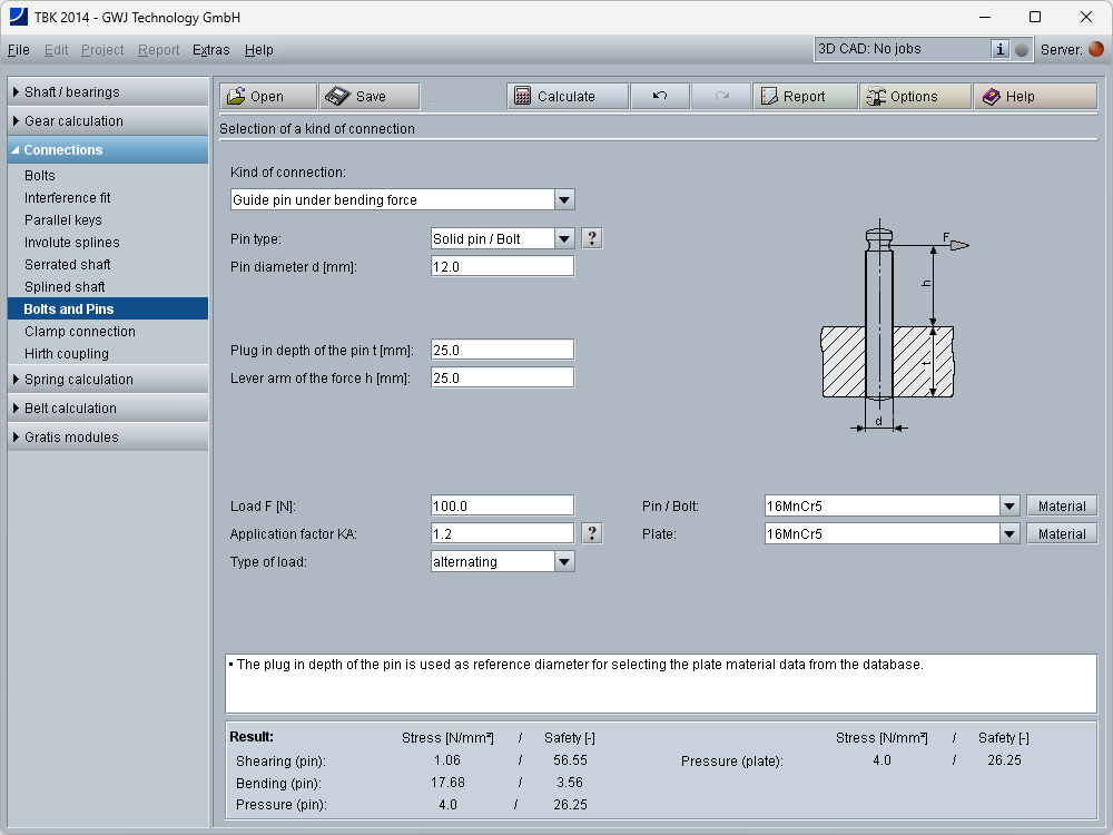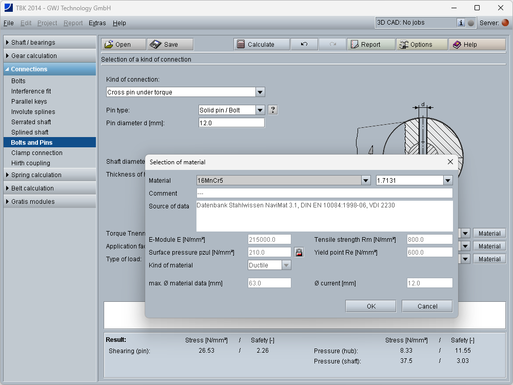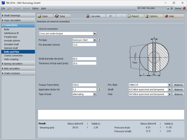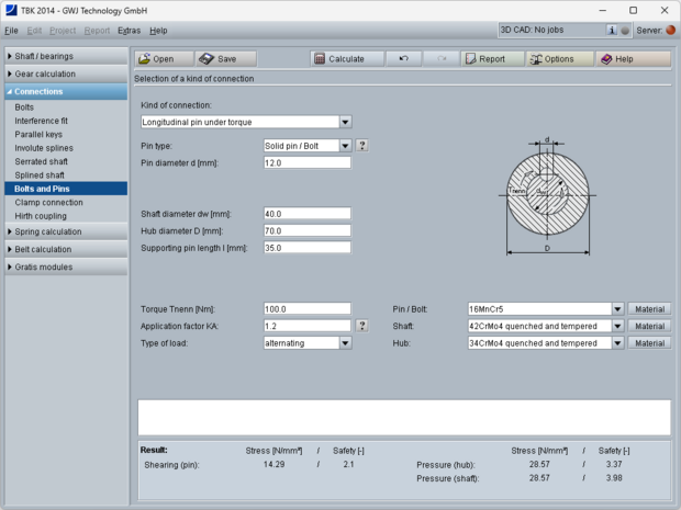 All calculations are based on generally accepted literature (e.g., Niemann and Decker). Futhermore, different pin types are available for the calculation: solid pin/bolt, grooved pin, (hollow) dowel pin as well as coiled spring pin.