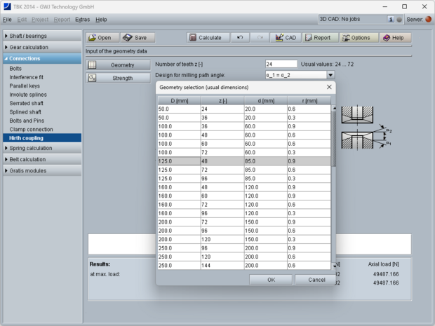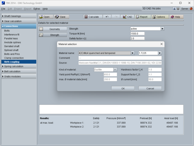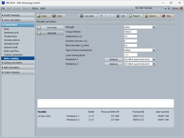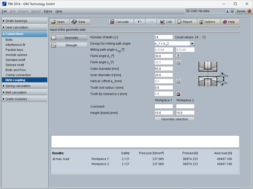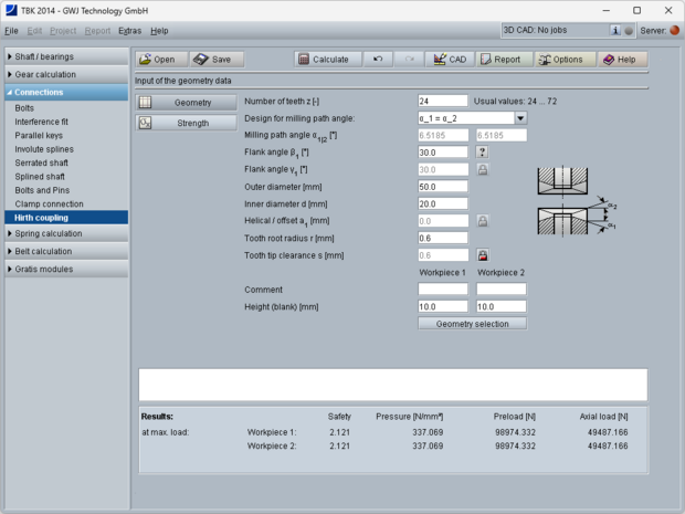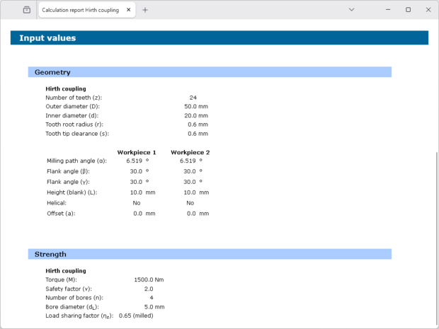 The calculation module can be used to determine the geometry and strength of Hirth couplings. By entering the number of teeth, outer and inner diameter, flank angle and tooth root radius, the geometry is automatically calculated. Various special cases of the connection are also supported.