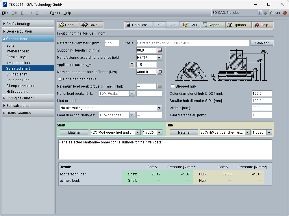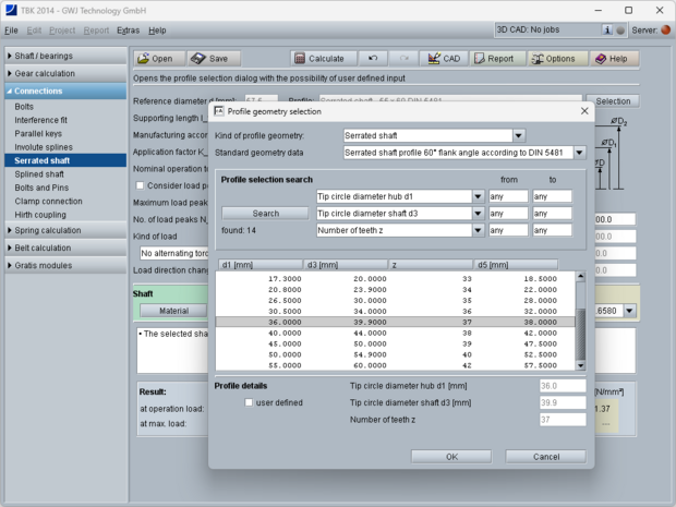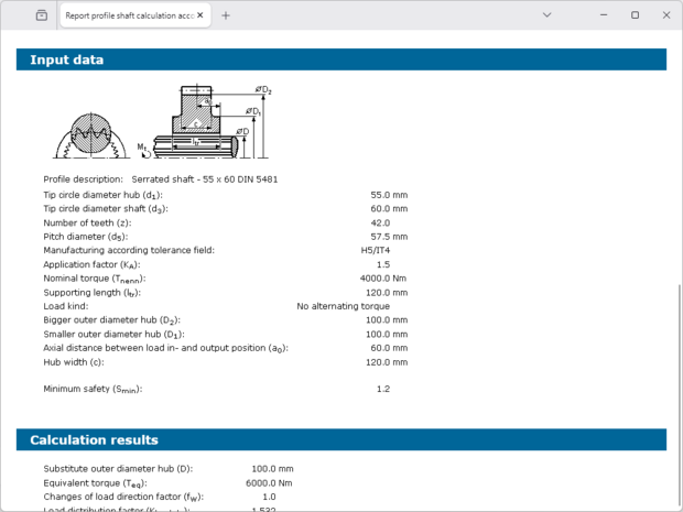The calculation module allows to carry out a strength calculation according to Niemann for shaft-hub joints with serrated shafts according to DIN 5481. The geometry can be comfortably selected from the database or identified with the profile search function. In addition, the possibility for an own input of serrated shaft geometry is also available.