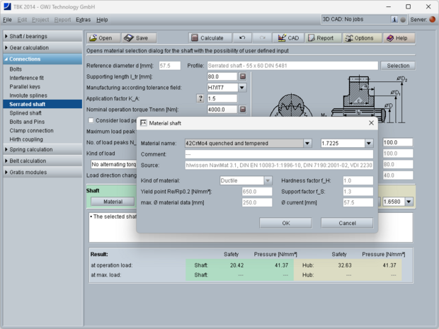 The allowed pressures will be calculated on the base of the material properties. So, it is possible to use special metal materials. Available materials can be selected very easily from the integrated material database. For different load in and output, the load factor according to DIN 6892 will be calculated on the base of the given geometry. Additional load peaks and alternating torque can be defined for the calculation.