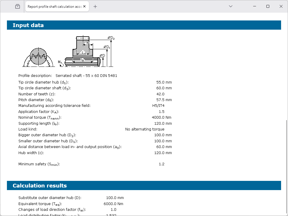 In the result overview, the safeties and the pressures of the operation load and at the maximum load for the shaft and the hub will be displayed already during the input. After the calculation is finished, a calculation report can be generated for the documentation. This report includes the calculation method, the input values and detailed comprehensible results.