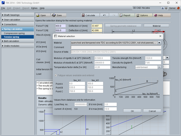 The calculation is possible for dynamic or static/quasi static loads. The spring materials can be comfortably selected from the database. The own input of a material is also possible. So, the calculation with special material is supported. For hot-formed spring materials, a coil distance is definable. Additionally, the tolerances for the wire diameter can be defined according to DIN 2076 B and C, DIN 2077 or individually. Depending on the manufacturing process (hot-rolled or cold-formed), the tolerances will be calculated according to DIN 2095 or DIN 2096. Furthermore, the eigenfrequency will be calculated. The operation temperature also will be taken into consideration.