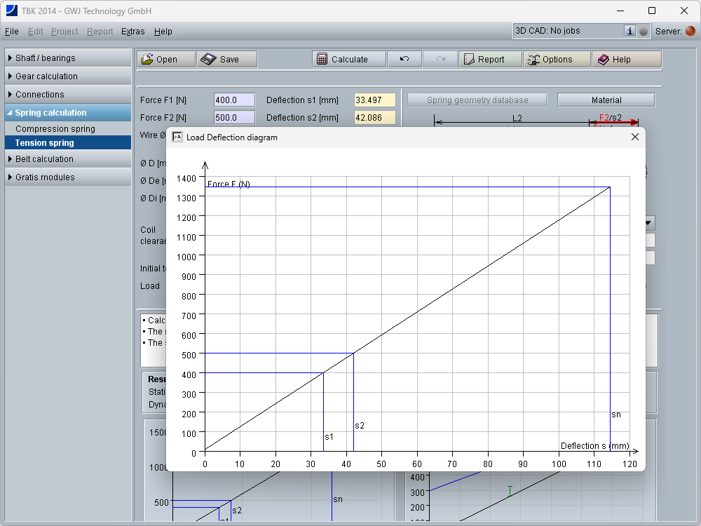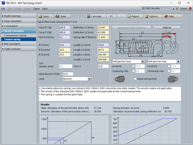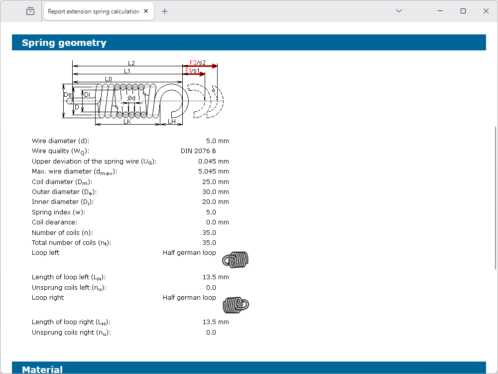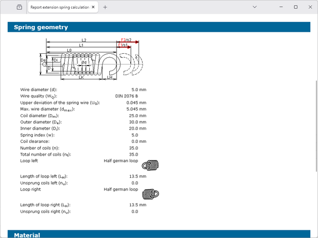 The calculation takes place according to DIN 13906-2. The input of spring forces or deflections or a combination of both is possible. The other values for the extension spring geometry (e.g., lengths, diameters and coils) can be entered manually. During the input of the manual definition of the spring geometry, the values, depending on the entered value, are calculated automatically.
