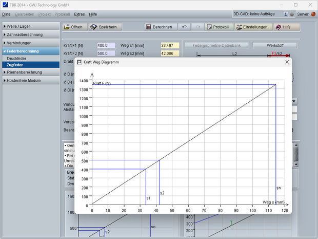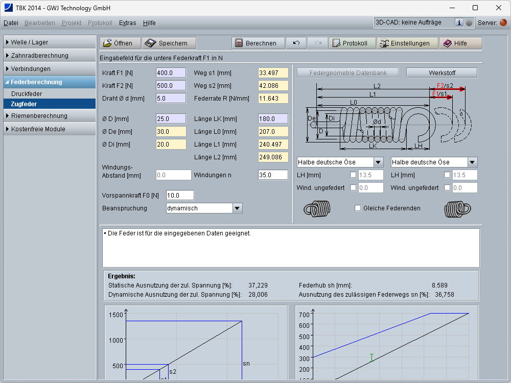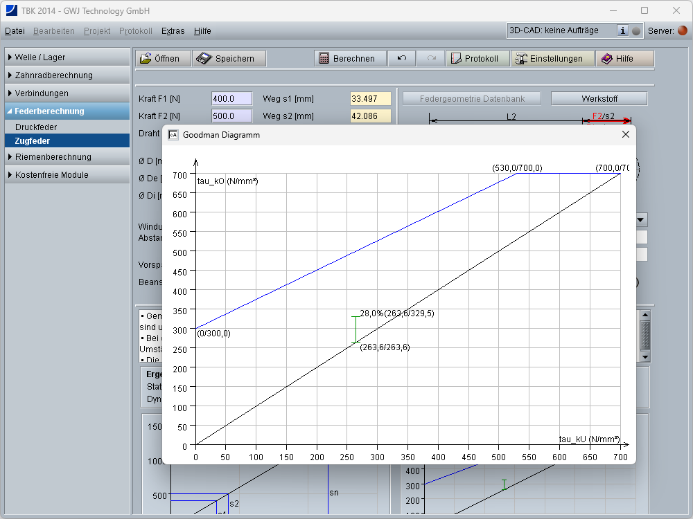 Die wichtigsten Ergebnisse, d.h. die statische und dynamische Ausnutzung der zulässigen Spannung, der Federhub und die Ausnutzung des zulässigen Federweges werden bereits während der Eingabe übersichtlich angezeigt. Zusätzlich erfolgt die Darstellung des Goodman- und des Kraft-Weg Diagramms. Die Diagramme lassen sich per Mausklick vergrößert darstellen.