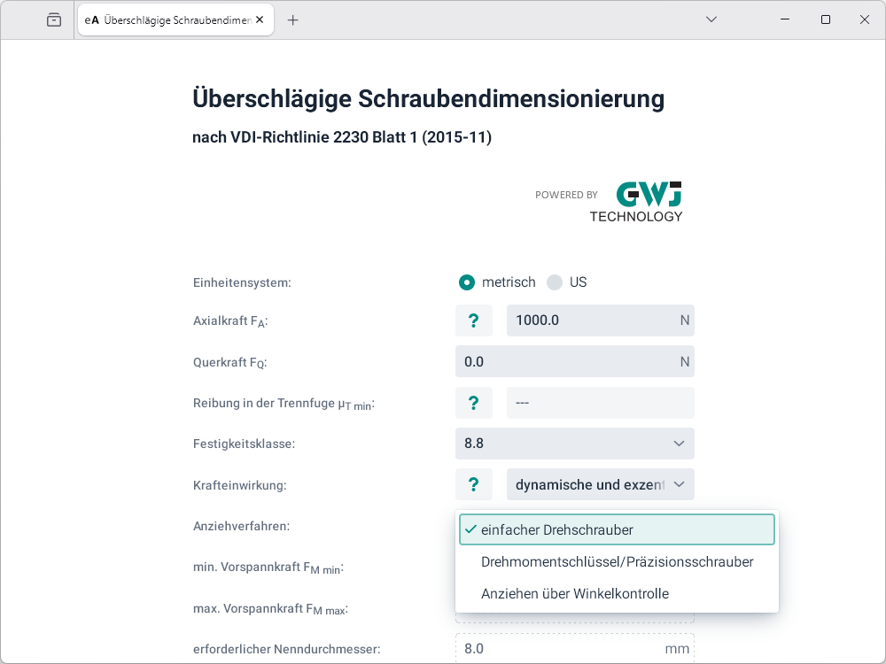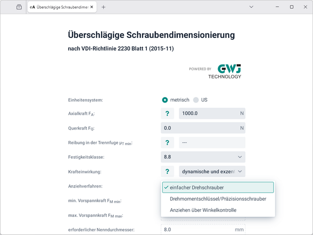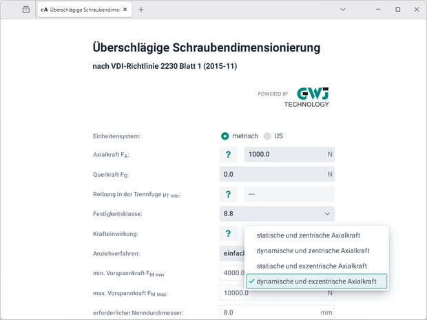 Zur schnellen und einfachen Ermittlung eines Mindestschraubendurchmessers wird die Grobdimensionierung der VDI 2230 genutzt. Damit lassen sich, unter der Vorgabe der max. Axialkraft und/oder Querkraft, die min. und max. Vorspannkraft sowie der Mindestschraubendurchmesser abschätzen. Bei der Dimensionierung nach der Querkraft wird zusätzlich der Reibfaktor in der Trennfuge berücksichtigt. Die Berechnung kann mit den drei Schraubenfestigkeitsklassen 8.8, 10.9 und 12.9 durchgeführt werden. Für die Krafteinwirkung bzw. Krafteinleitung stehen folgende Auswahlmöglichkeiten zur Verfügung: