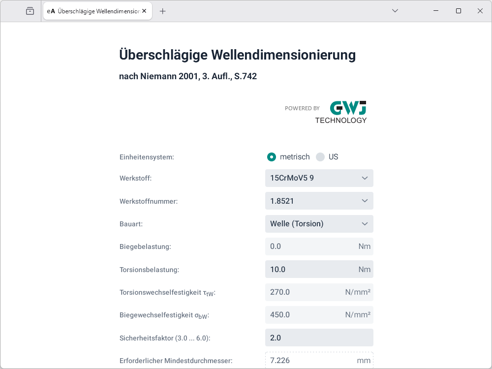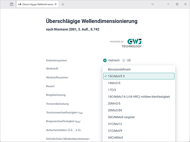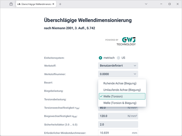 zur Auswahl. Nach Eingabe der entsprechenden Belastung - Biege-, Torsionsbelastung oder beides - sowie des gewünschten Sicherheitsfaktors wird der erforderliche Mindestdurchmesser ermittelt.
