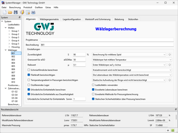 - Direktintegrierte Wälzlagerberechnung zur Ermittlung der nominellen und erweiterten Lebensdauerberechnung nach DIN ISO 281 inkl. Wälzlagerdatenbanken und Schmierstoffdatenbank