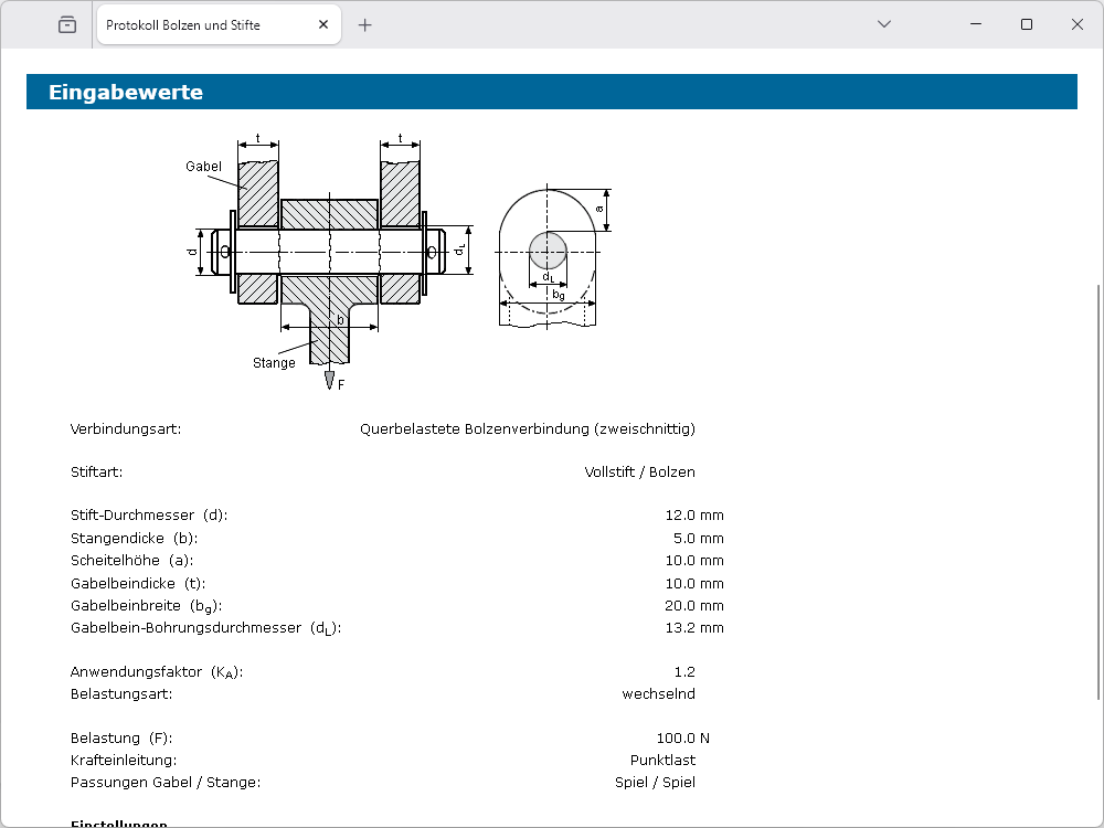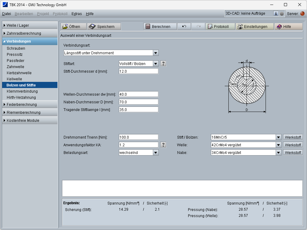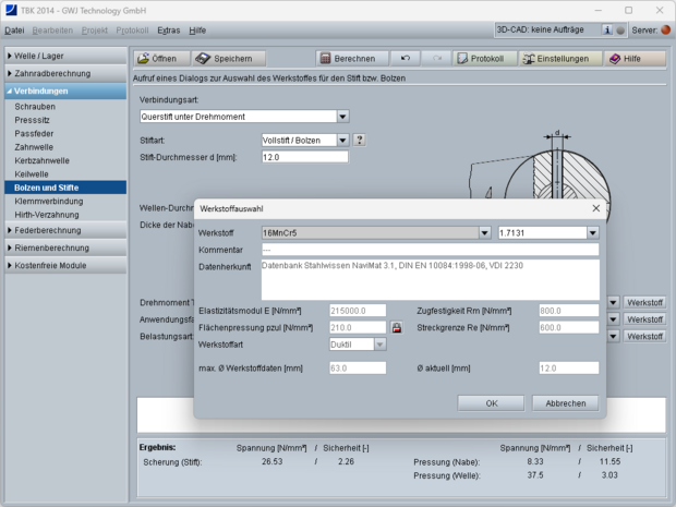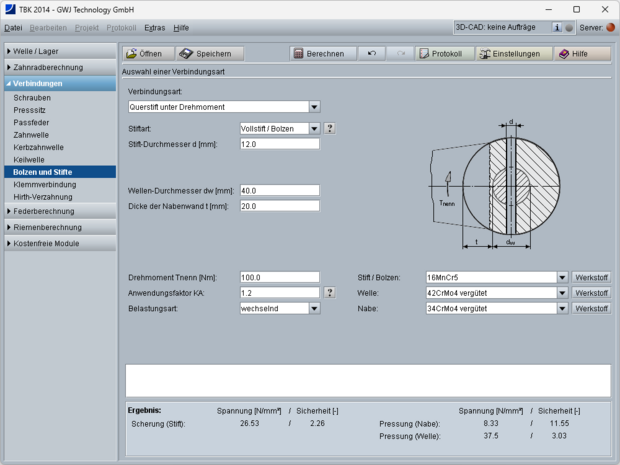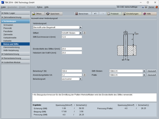 Alle Berechnungen erfolgen auf Basis anerkannter Fachliteratur, wie zum Beispiel nach Niemann und Decker. Weiterhin sind für die Berechnung verschiedene Stiftarten verfügbar. So kann zwischen Bolzen bzw. Vollstift, Kerbstift, Spannstift oder Spannhülse sowie Spiralspannstift gewählt werden.