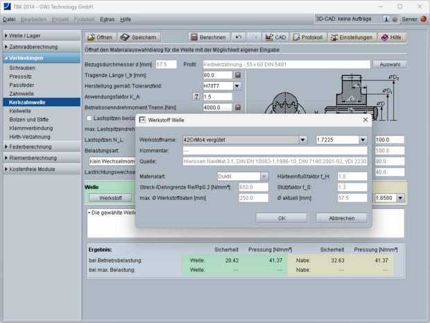 Die zulässigen Pressungen werden aus den Werkstoffeigenschaften ermittelt. Vorhandene Werkstoffe stehen auf einfache Weise aus der integrierten Werkstoffdatenbank zur Auswahl. Zusätzlich können auch individuelle Werkstoffe für die Berechnung eingegeben werden. Für unterschiedliche Lastein- bzw. ableitungen wird der Lastverteilungsfaktor auf der Basis geometrischer Vorgaben des Anwenders analog der DIN 6892 berechnet. Die Anzahl Lastspitzen und die Art eines vorhandenen Wechseldrehmomentes können für die Berechnung ebenfalls angegeben werden.