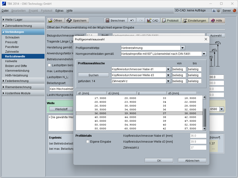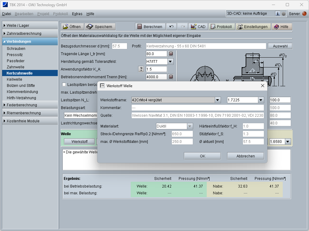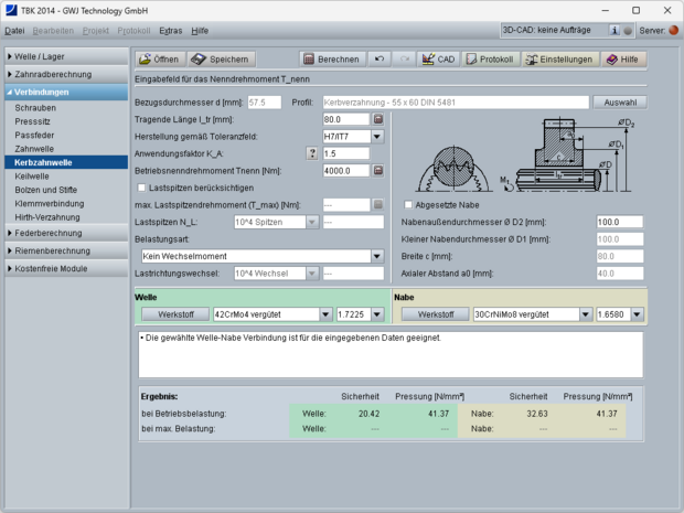 Mit dem Modul Kerbverzahnung kann die Festigkeitsberechnung von Welle-Nabe-Verbindungen mit Kerbzahnprofilen nach DIN 5481 durchgeführt werden. Die Berechnung erfolgt nach Niemann „Maschinenelemente“ Band 1, Ausgabe 2001. Die Abmessungen können bequem aus einer Datenbank ausgewählt oder über die Profilsuche schnell identifiziert werden. Von der Norm abweichende Profile können für die Berechnung vorgegeben werden.