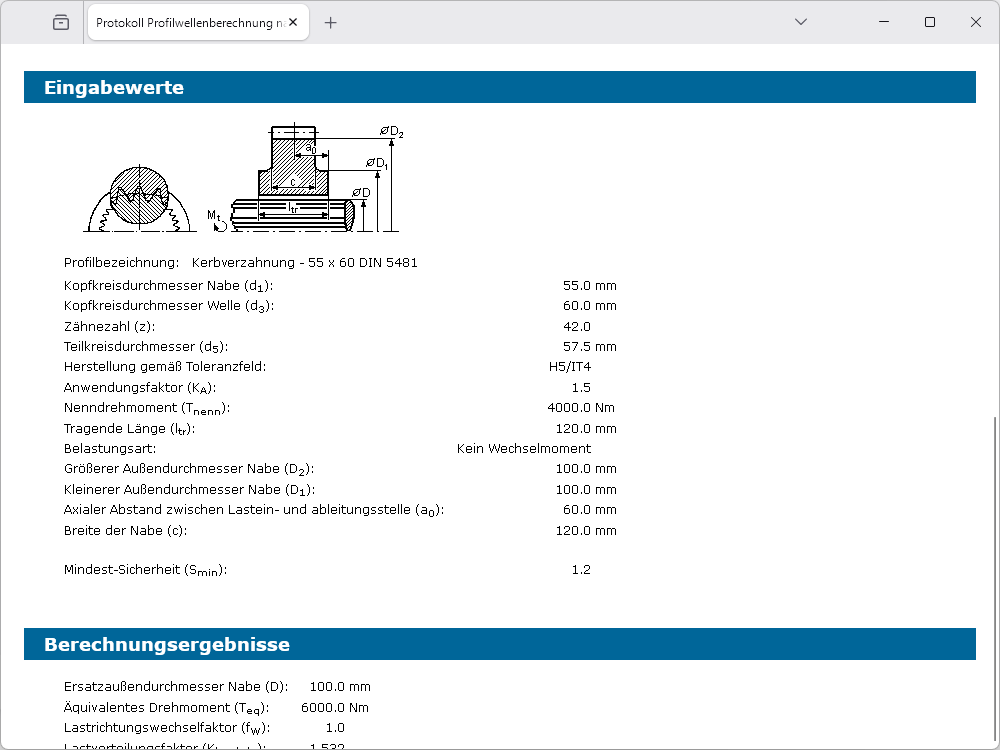 Die Sicherheiten und Pressungen bei der Betriebsbelastung und bei der maximalen Belastung für Welle und Nabe werden bereits während der Eingabe übersichtlich in der Ergebnisübersicht angezeigt. Zur Dokumentation der Berechnung bekommt der Anwender ein Berechnungsprotokoll. Dieses enthält die Angabe der Berechnungsmethode, die Eingabedaten und die detaillierten, nachvollziehbaren Ergebnisse. Das Protokoll steht sowohl im HTML- als auch im PDF-Format zur Verfügung.