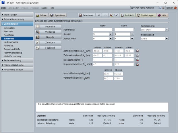 Zur Festlegung der Toleranzen können die Verzahnungsqualität und die Abmaßreihe nach DIN 5480, DIN 5482, ANSI B92.2 und ANSI B92.1 aus entsprechenden Auswahllisten gewählt werden. Damit werden die zulässigen Abweichungen und die Zahndickenabmaße automatisch ermittelt. Die Ermittlung der Zahndickenabmaße kann auch aus gemessenen Werten bzw. aus vorgegebenen Prüfmaßen erfolgen. Die Prüfmaße für die Verzahnung sowie das Normal- und Verdrehflankenspiel werden ebenfalls mit berechnet. Für die Prüfmaße werden die empfohlene Messzähnezahl und der Kugel- bzw. Rollendurchmesser vorgeschlagen und können individuell angepasst werden. Weiterhin ist die Darstellung der exakt berechneten Zahnform möglich. Diese kann im 2D DXF ausgegeben oder über die eAssistant CAD-PlugIns in verschiedenen CAD-Systemen als 3D-Modell generiert werden. Dabei werden auch die Zahndickentoleranzen mit berücksichtigt, so dass die Zahnform auch für die Fertigung, z.B. mittels Fräsen, Laserschneiden oder Drahterodieren, weiterverwendet werden kann.