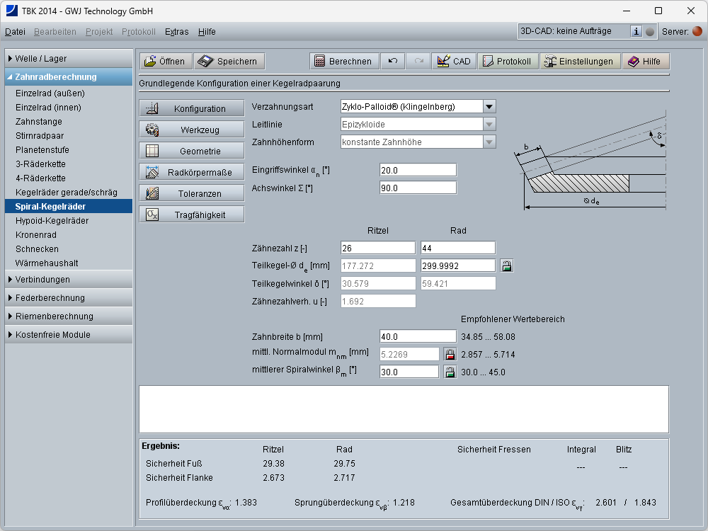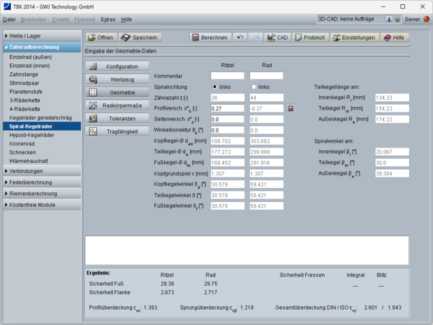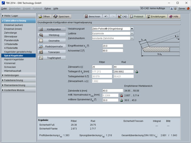 Die Berechnung der Profil-, Sprung- und Gesamtüberdeckung erfolgt gemäß ISO 23509 anhand der Ersatzverzahnung. Weiterhin werden die Drehmaße mit Kegellängen und Spiralwinkeln berechnet. Ergänzend werden weitere Radkörpermaße inklusive Kopfkreisabstand und Einbaumaß ermittelt. Das Einbaumaß kann zusätzlich individuell vorgegeben werden.