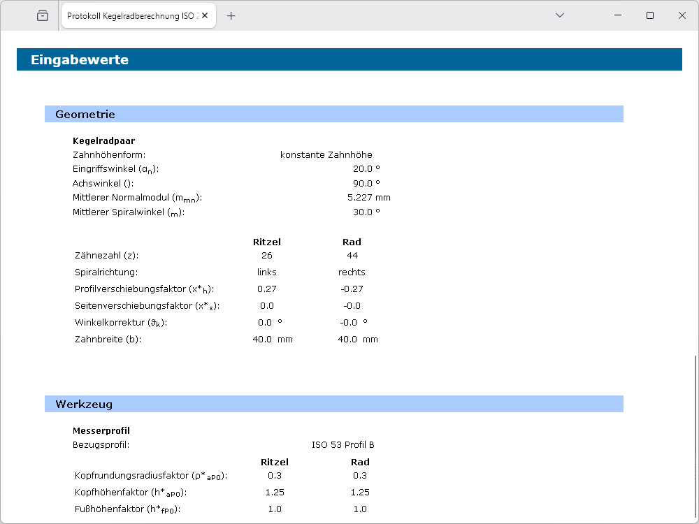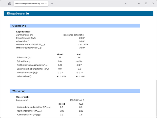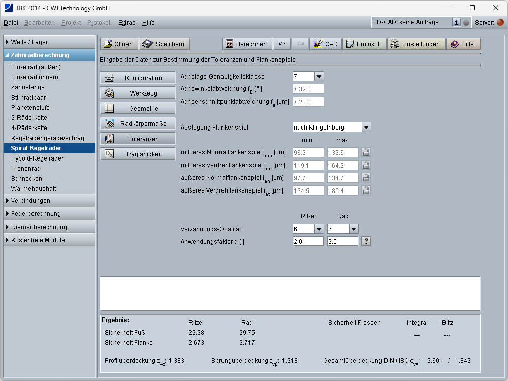 Die Flankenspiele können nach Klingelnberg oder Niemann ausgelegt oder individuell vorgegeben werden. Weiterhin stehen die Toleranzen DIN 3965 für Abweichungen einzelner Bestimmungsgrößen, d. h. Achsenwinkel- und Achsenschnittpunkts-abweichungen zur Auswahl. Die Verzahnungsqualitäten können nach ISO 17485 gewählt werden. Die sich aus der gewählten Verzahnungsqualität ergebenden Toleranzen bzw. zulässige Abweichungen werden ebenfalls mit berechnet. Darüber hinaus werden die Zahnhöhen, Zahndicken und Zahndickensehnen ermittelt.