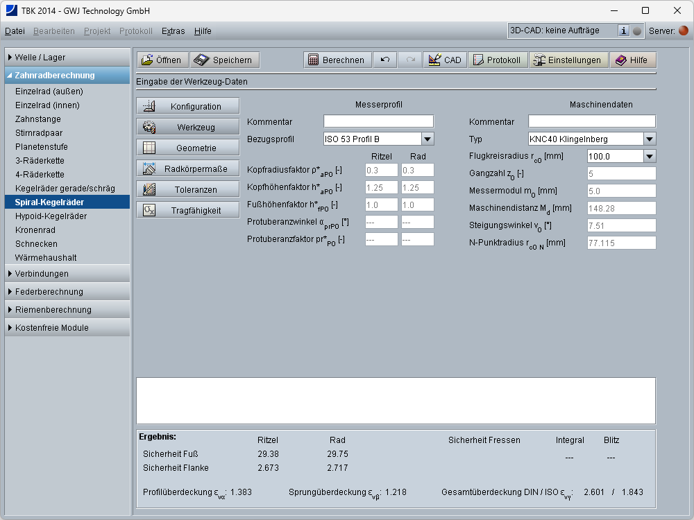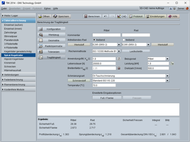 Neben der Geometrieberechnung steht auch die Tragfähigkeitsberechnung nach ISO 10300 Methode B1 zur Verfügung. Hiermit können die Sicherheiten für Zeit- bzw. Dauerfestigkeit sowie für die statische Sicherheit berechnet werden. Es werden die Zahnfuß- sowie Flanken- bzw. Grübchentragfähigkeit ermittelt. Innerhalb der Tragfähigkeits- bzw. Festigkeitsberechnung stehen eine Werkstoff- und Schmierstoffdatenbank zur Verfügung. Zusätzlich kann auch die Betriebsweise, d. h. schwellender, wechselnder oder reversierender Betrieb, mit in der Berechnung berücksichtigt werden.