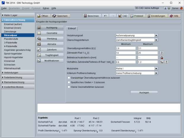 - Entwurfsauslegung: unter Vorgabe von Leistungsdaten, Werkstoff etc. sowie des gewünschten Übersetzungsverhältnisses und optional eines Achsabstandsbereiches werden mögliche Ausführungsvarianten vorgeschlagen und tabellarisch zur Auswahl gestellt