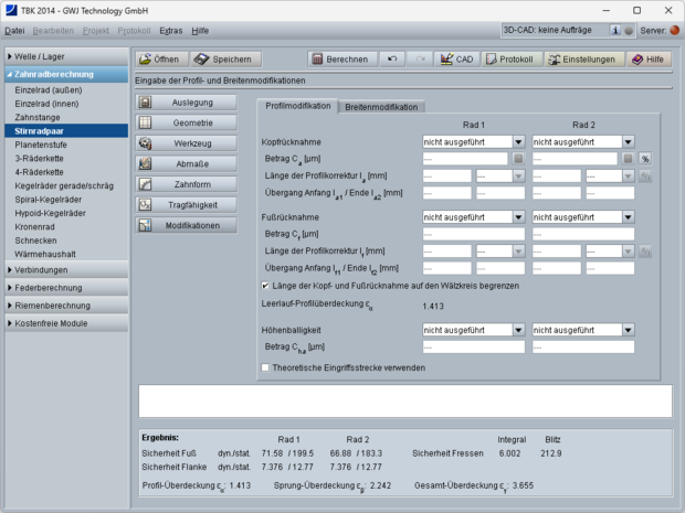 - Vorgabe und Berücksichtigung von Profilmodifikationen in der Zahnform: lineare und kreisförmige Kopfrücknahme, lineare und kreisförmige Fußrücknahme, symmetrische Höhenballigkeit