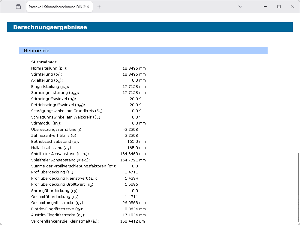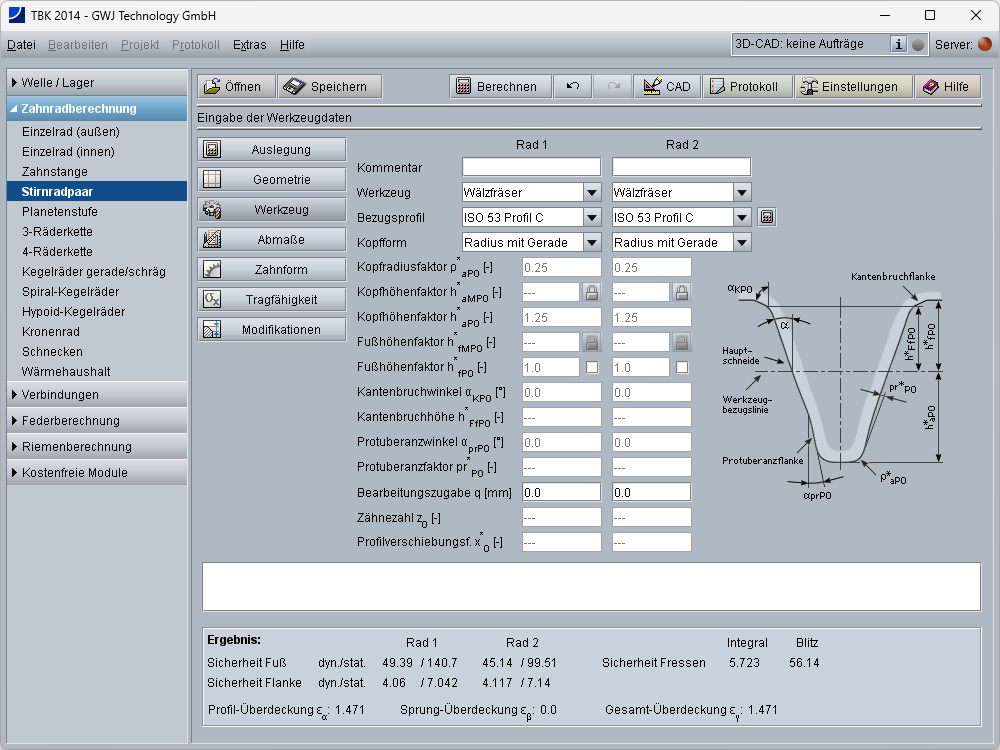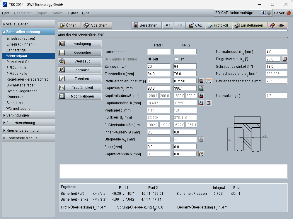 - Vorgabe des Betriebsachsabstandes oder Berechnung aus vorgegebenen Profilverschiebungsfaktoren