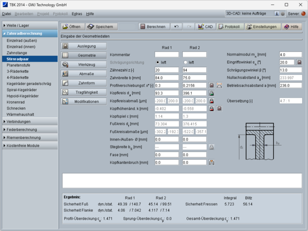 einer Stirnradverzahnung: Anforderungen, Modul, Zahnbreite, Wahl und Aufteilung Profilverschiebungssumme, Optimierung der Fuß-, Flanken- und Fresstragfähigkeit - Fertigungszeichnung, Herstelldaten/Verzahnungsstempel: Nachrechnung auf Basis von Zeichnungsangaben, Ermittlung der